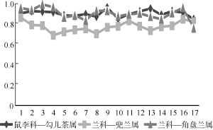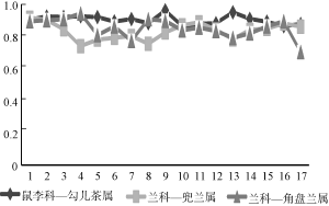 更进一步地, 笔者希望明确科属间的抽取性能差异是源于少数极端样本的影响, 还是组间样本整体的差异所导致。为此, 对三组样本中的文档分别随机分配1-17的序号, 比较每篇文档中信息的抽取性能。从图6、图7能够清楚地看到, 类属相同的物种, 其描述文本信息抽取的准确率、召回率虽有波动, 但总体比较平稳。这表明导致科属间性能差异的主要原因并非来自个例的影响, 这一点在图7中表现尤为清晰。