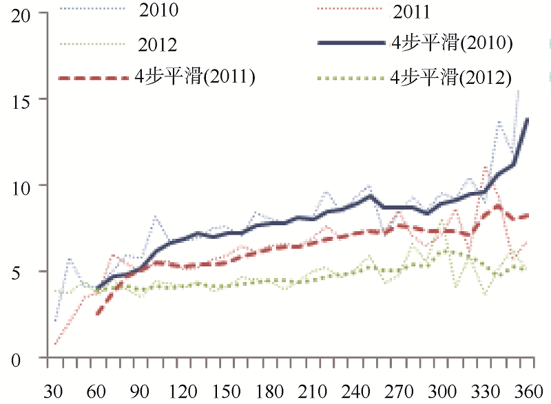 (6) 移动平均法。由于影响论文被引频次的因素很多, 尽管采用了上面的种种措施, 依然不能完全消除其影响, 导致某些地方波动幅度过大, 因此有时有必要利用移动平均法弱化异常波动以保持总体变化趋势。