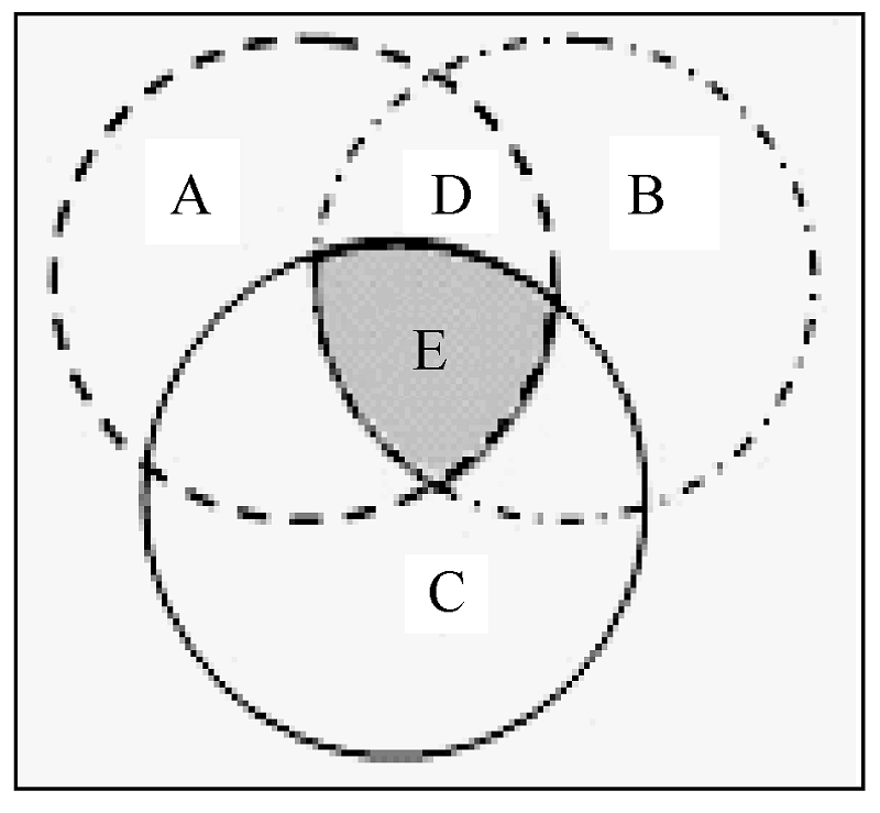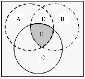 在去掉这些论文后, 计算结果显示: 当题名长度超过20后, 随着题名长度的增加, 被引频次总体上依然逐渐降低。笔者根据上述104篇论文的被引情况猜测是由于论文的专指度太高导致的。一篇论文被发现后, 是否阅读, 最终还处决于引用者的研究兴趣与被引论文所涉及的研究内容的相关程度。虽然题名越长, 文献检索时被命中的几率越大; 但同时, 题名越长, 题名所包含的独立概念越多, 表示所研究的内容越具体, 研究范围越窄。如图9所示, A、B、C各表示论文题名中涉及一个独立概念的文献范围, 独立的意思是三个概念相互之间不存在隶属关系; E(中间阴影区域)表示同时包含A、B、C三概念的文献范围。可以看出, E区域所在范围比任何一个概念所占区域小得多。科技论文的标题通常只有一个句子, 是对论文表达内容的高度概括, 全面或从不同的侧面体现作者的写作意图、研究主题或体现论文的亮点。如果题名比较长, 研究人员可能会因为其中的某些概念与自己的研究兴趣相去较远而忽视这篇论文, 自然不会引用; 题名越长, 独立概念越多, 被忽视的可能性越大。因此, 论文题名过长, 反而会导致被引频次降低。被命中的概率和被关注的概率, 这两个因素同时影响着被引频次, 题名越长, 被命中的概率越大, 同时被关注的概率越低。图5可能是这两种因素的影响叠加的结果。
