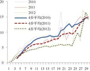(4) 这些相关参数本身在各数据段的分布并不均匀。2010年题名长度为11的论文数就有1 413篇, 而三年的全部数据中, 题名长度超过20的论文总数只有1 378条, 分布跨度约占全部的40%(题名最小长度为1, 最大为52), 数据量却只有不到全部数据的3%, 这种不均匀分布也导致平均值受到偶然因素的影响程度有差异, 数量越少, 受影响的程度越高, 这也是笔者特地针对论文数大于10的情况做统计分析的原因。尽管如此, 也不能完全消除这种由于数量少带来的影响, 图1-图7两端异常情况或许就源于此。