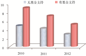 图8显示受基金支持的论文被引频次更高。2010年-2012年有基金支持的论文数分别是6 368, 7 502, 8 680; 无基金支持的论文数分别是8 252, 7 946, 7 615。这三年的数据正好代表了三种情况: 2010年有基金支持的论文数明显低于无基金支持的论文数; 2011年两者基本持平; 2012年则明显高于无基金支持的论文数(基金支持比例逐年提高, 是否表示SCIE论文更青睐于基金支持论文?有待研究)。但是无论哪种情况, 有基金支持的论文平均被引频次都明显高于无基金支持的论文的被引频次。这表明基金支持对文献的被引频次有明显的影响, 与文献[12-14]结论一致。